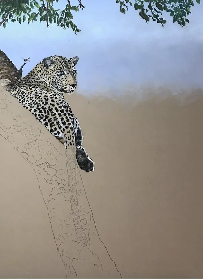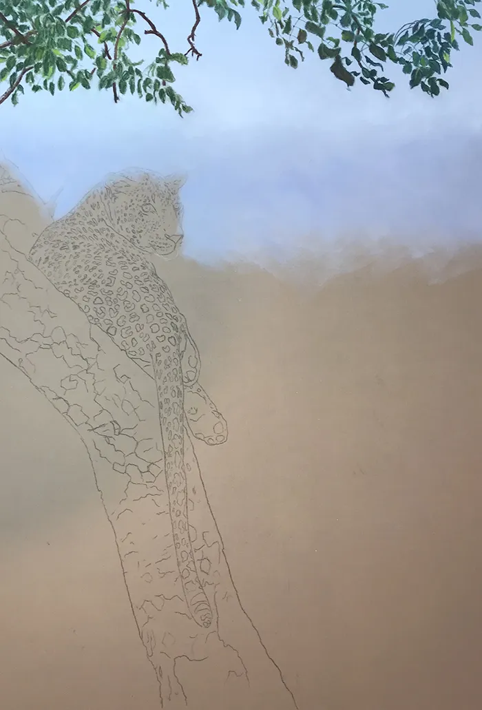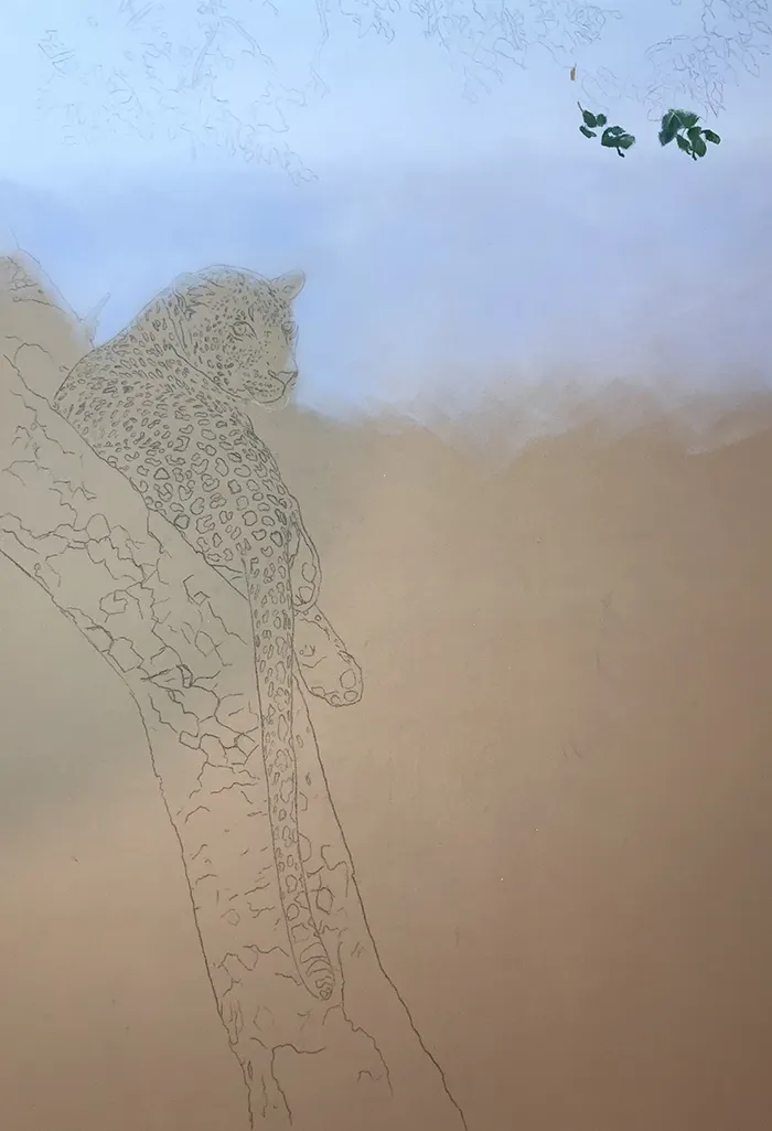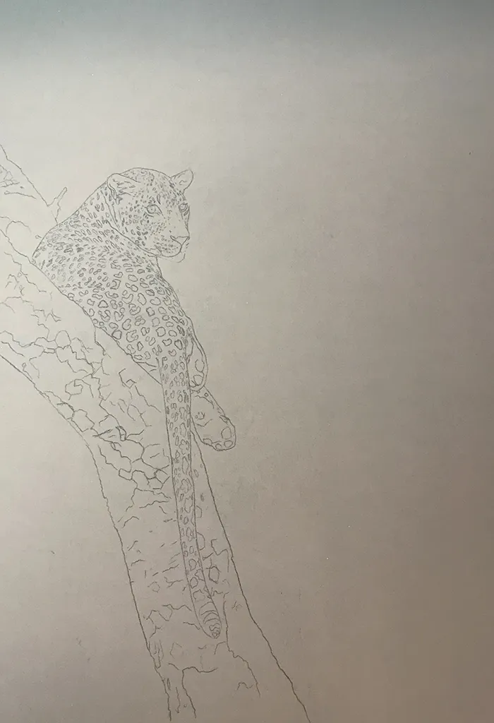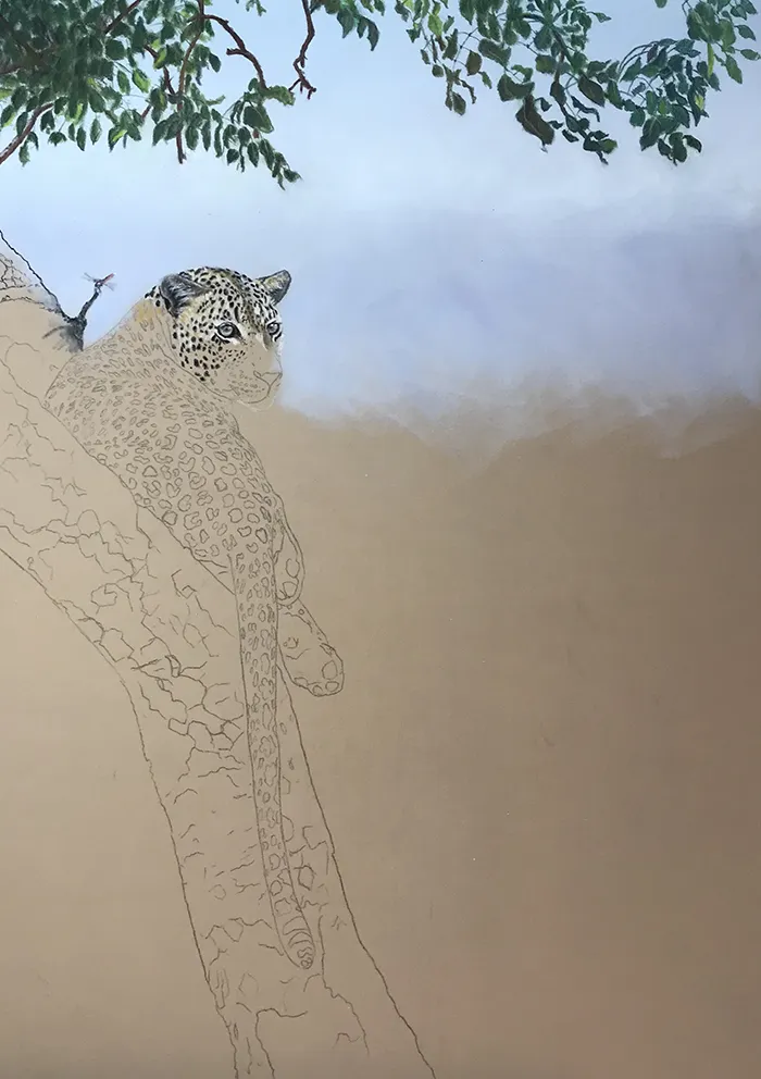 I've started by adding a light sketch of the leopard that's relaxed in the fork of the tree