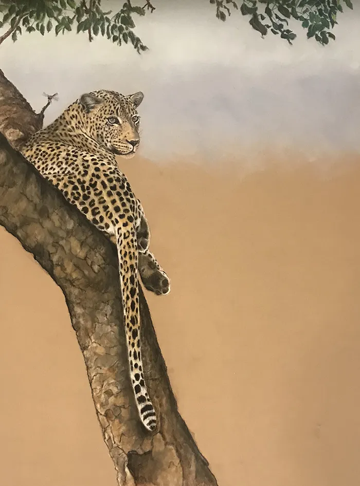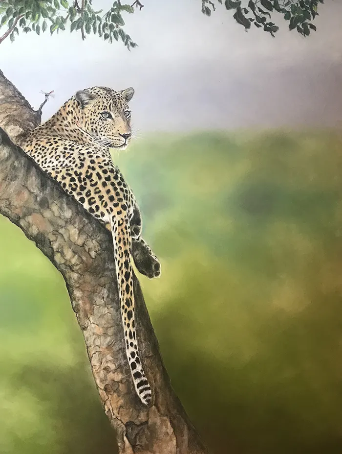 This is an image of a leopard relaxing high in a Marula tree and has been sketched in the medium of Pastel on a PastelMat paper whilst using a photograph courtesy of Mohammed Hayat.