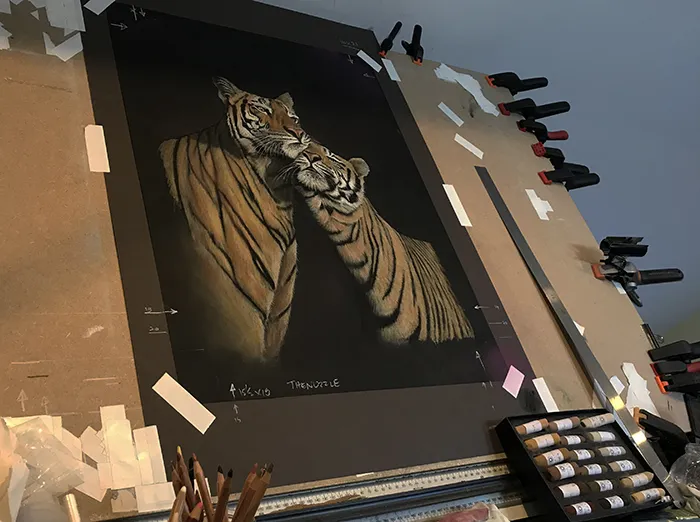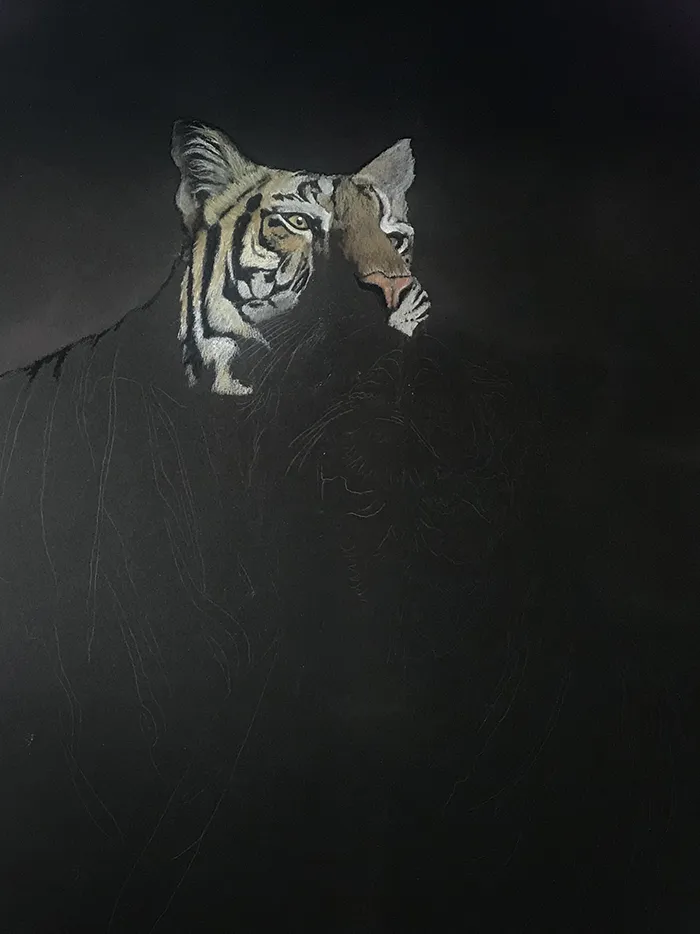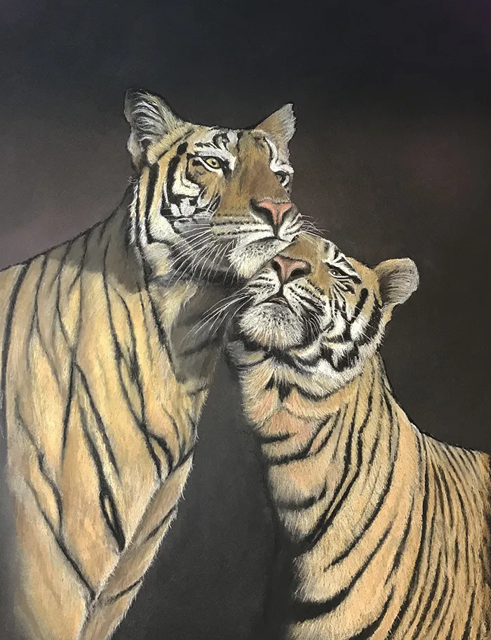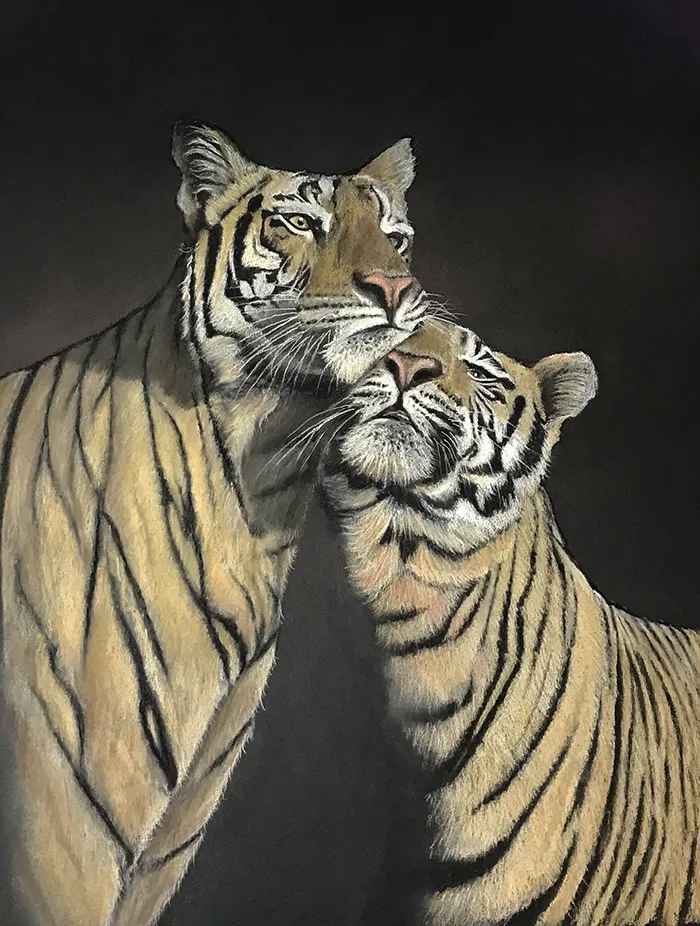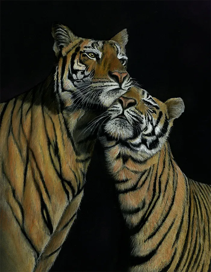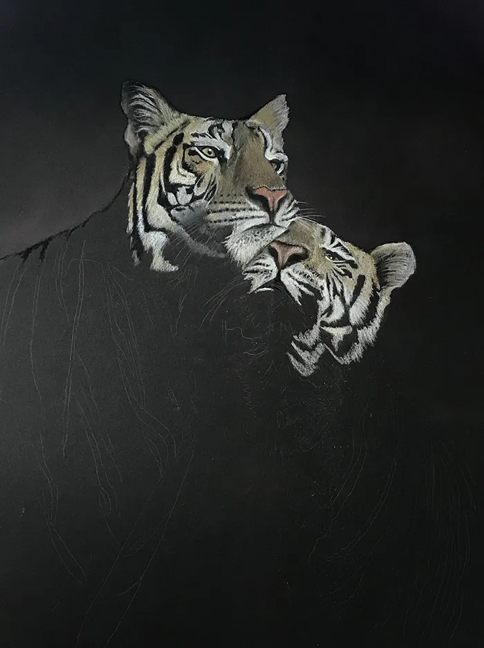 This is an intimate image of a tigress being nuzzled by her older cub which I have sketched using Pastels, Chalk and also Charcoal on a black background