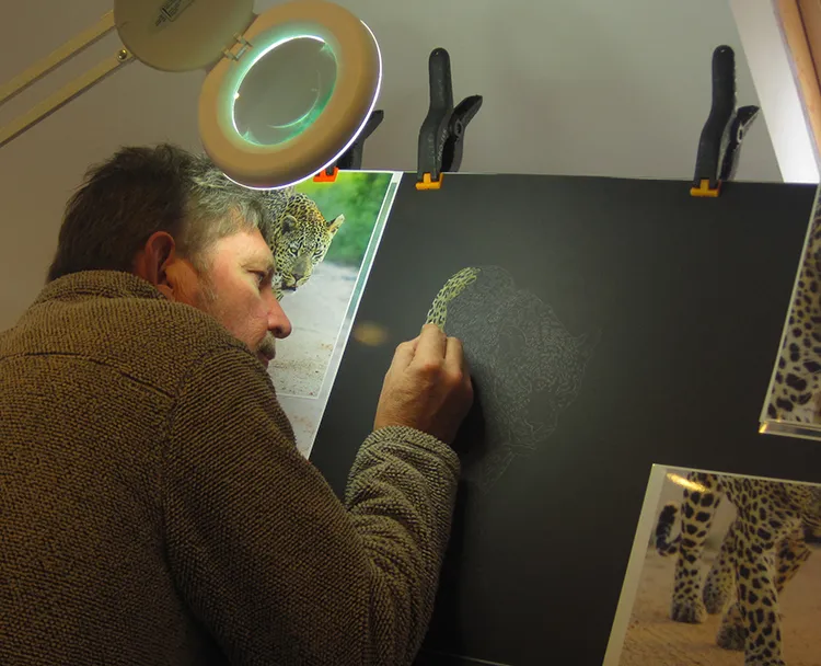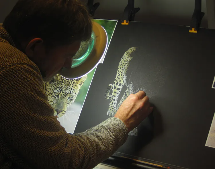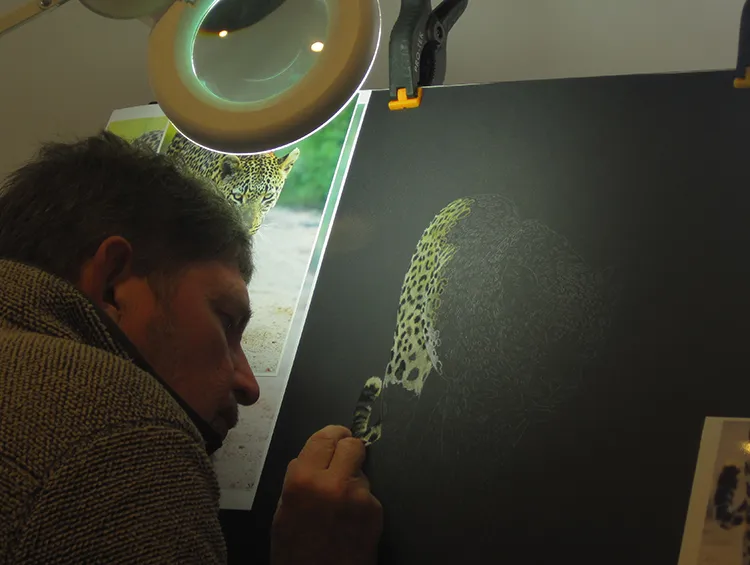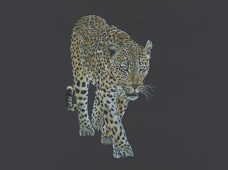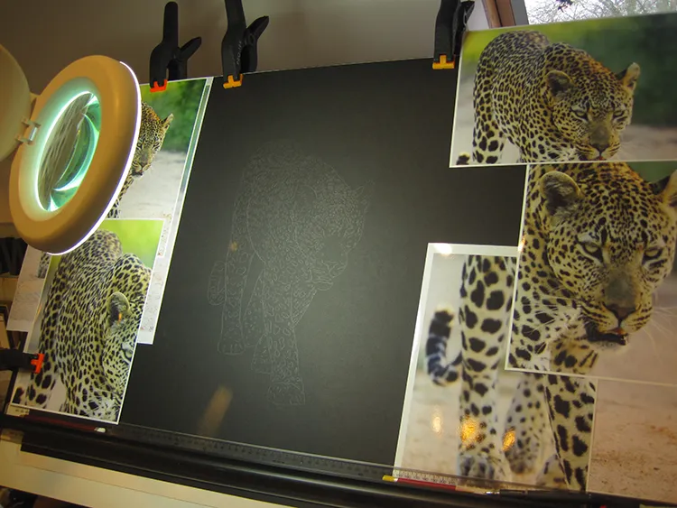 Starting on the hind quarters of the Ravenscourt leopard using OCHRE, CHALK and CHARCOAL for the rosettes
