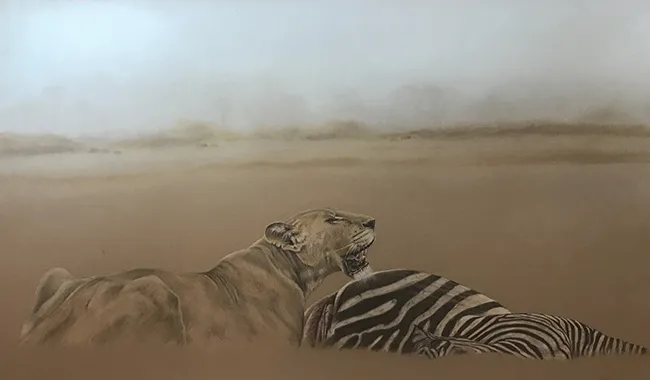 I have sketched this scene of a lioness taking a breather at a zebra kill using PASTELS on PASTEL MATT paper whilst using a beautiful reference photograph courtesy of Tim Nicklin