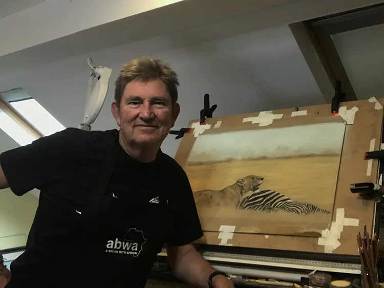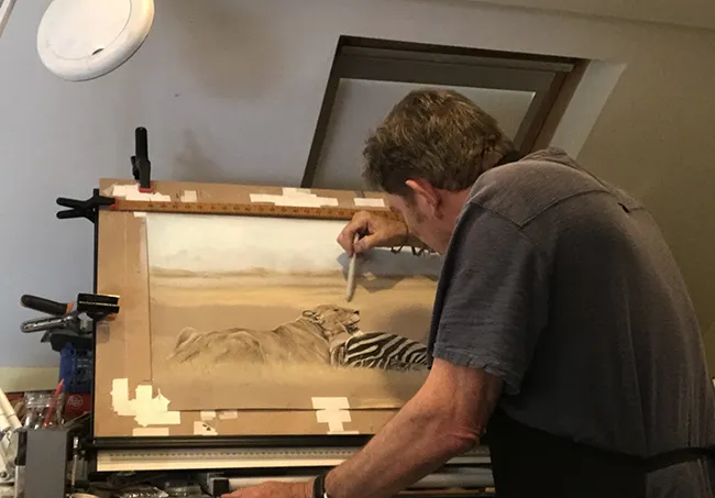 Here I am working at my Easel as I add the the black stripes of the fallen zebra