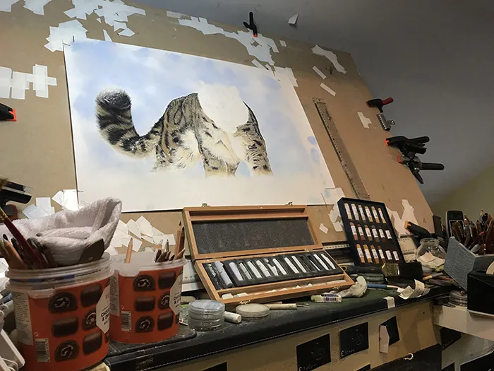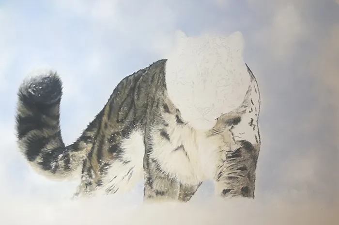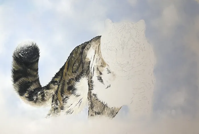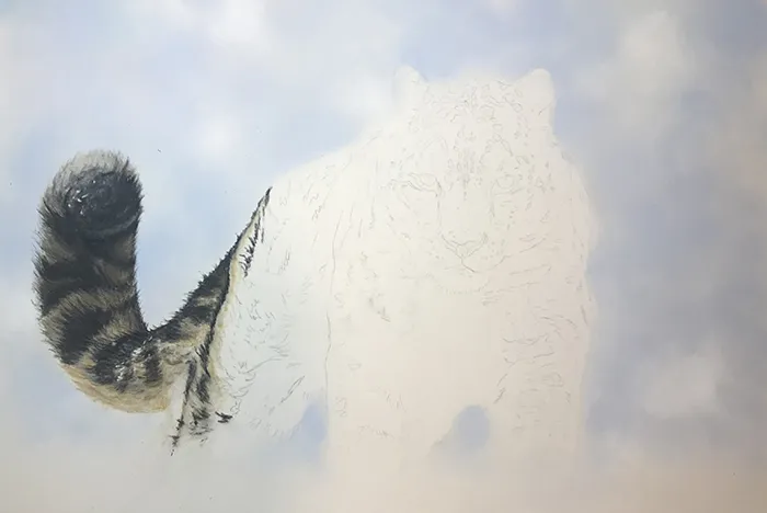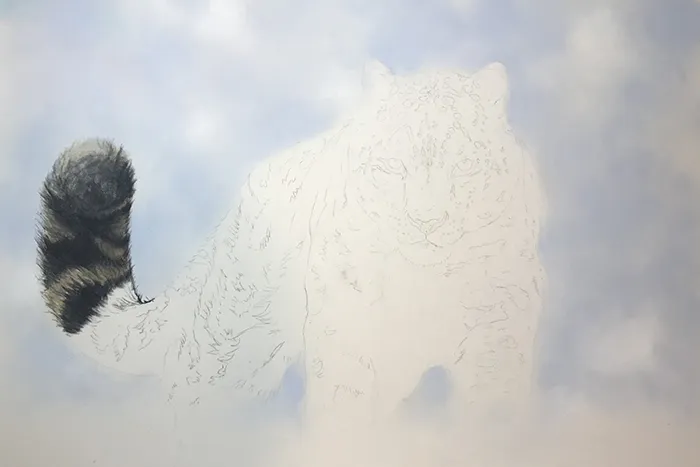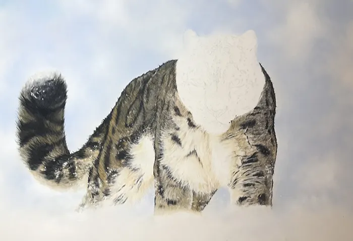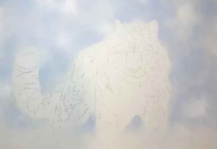 I've now lightly sketched in a rough outline of the snow leopard. The image size is 24in X 16in