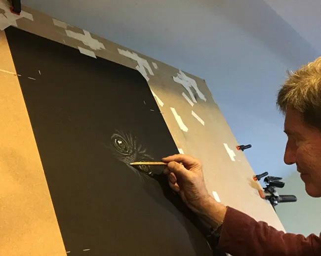 I have reversed the sketch and have put more detail in the eyes. It has been sketched using the medium of Chalk, Charcoal with a little Ochre in its eyes on black pastel paper.