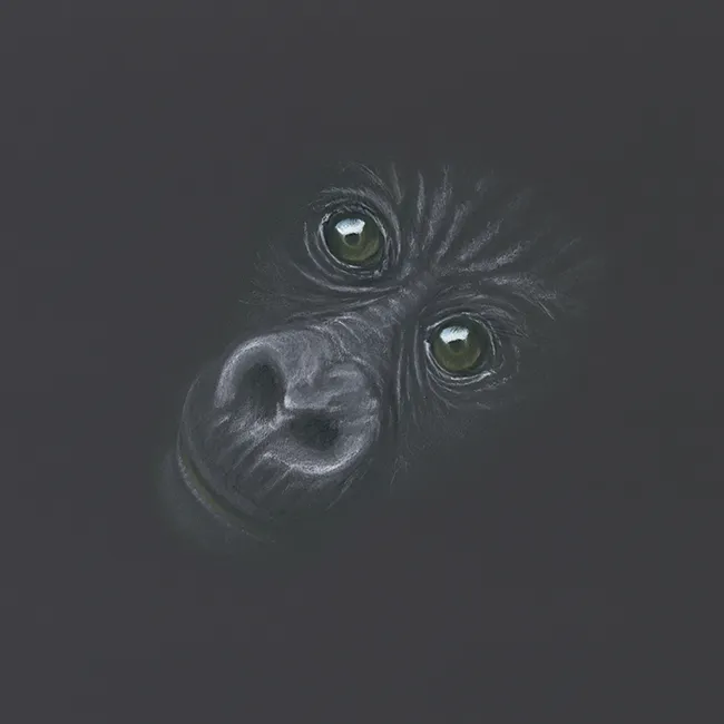 This is a sketch of a soulfull looking young gorilla. I first sketched this gorilla in 2003 with the title "Windows to the soul" which proved very popular