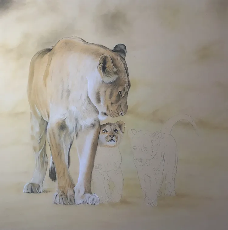 I've started by sketching in the lioness outline with her two cubs before working on the background