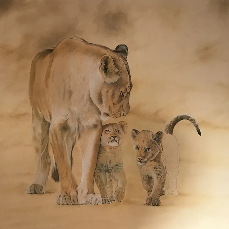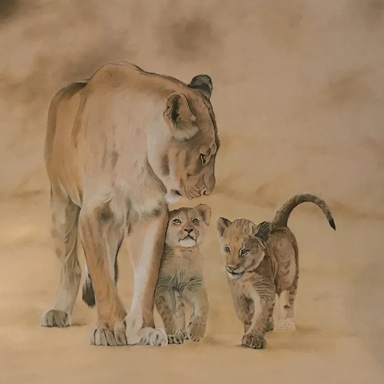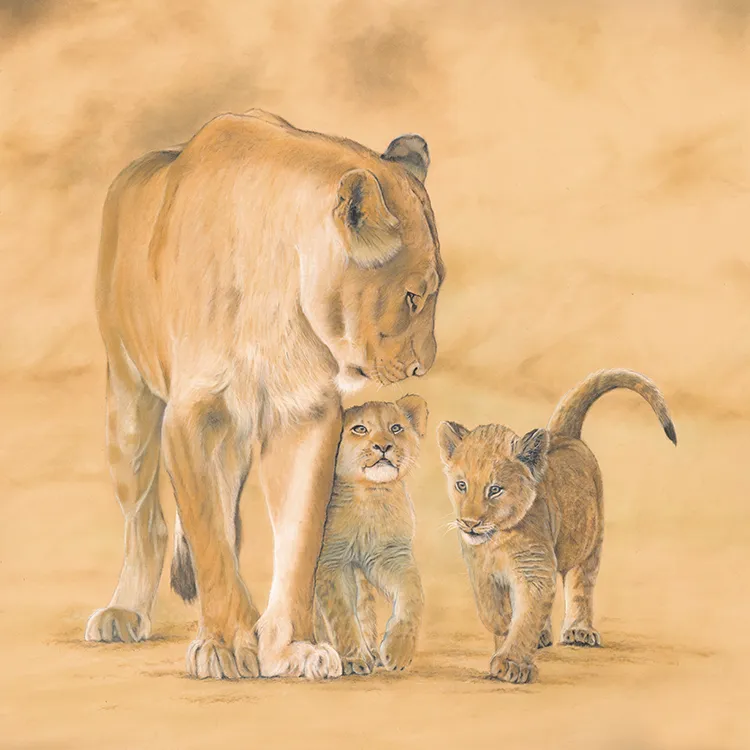This is an image of a lioness and two of her cubs It has been sketched using PASTELS on Pastel Matt Paper whilst using two excellent reference photographs courtesy of wildlife photographer Andrew Taylor.