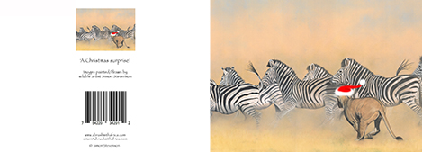 A lioness disguised in a Christmas hat chases a herd of zebra