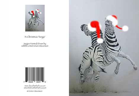 Click to enlarge A Christmas Tango card Two Burchell's zebra having a Christmas tango Product NameQuantityPrice Greeting card (Single) AU$ 1.75Add to Basket The Original of this image was sketched in Pastel MINIMUM ORDER of 6 CARDS (PICK & MIX) The inside of this card has been left blank for your own message