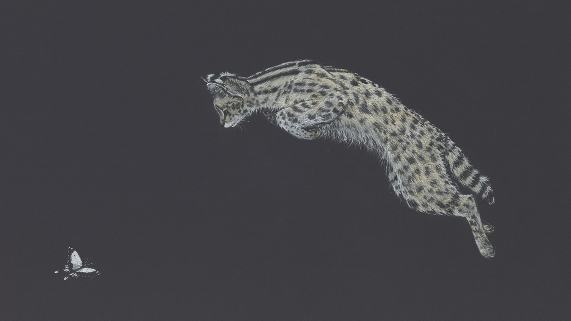 A serval jumps onto a Papilio Dardanus