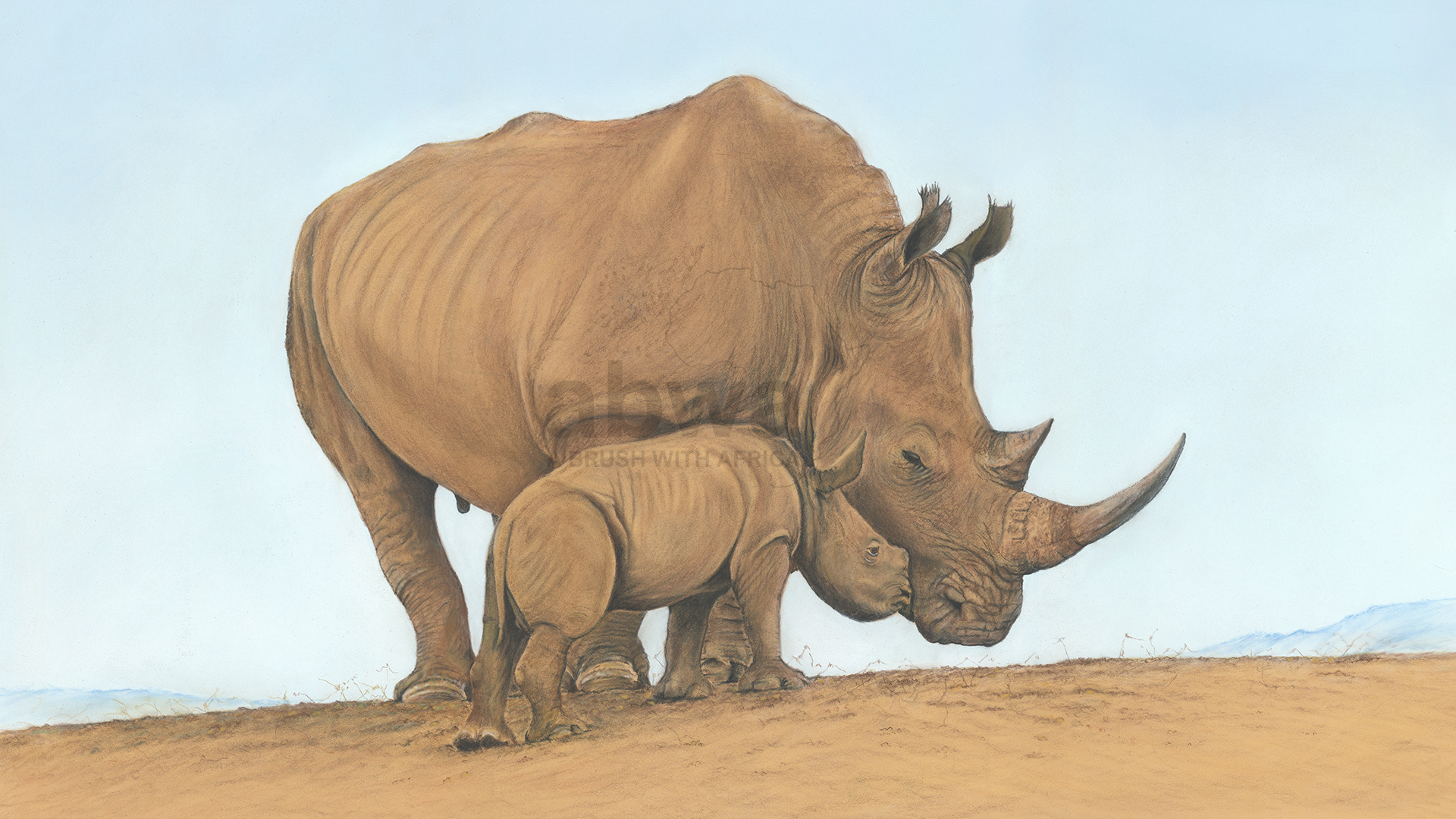 Click to enlarge Kifaru kidogo card A young southern white rhino calf nuzzles up to its mother.. Product NameQuantityPrice Greeting Card (Single) AU$ 1.75Add to Basket This original was sketched using pastels on Pastel Matt paper MAXIMUM ORDER of SIX CARDS (PICK & MIX) The inside of the card has been left blank for your own message