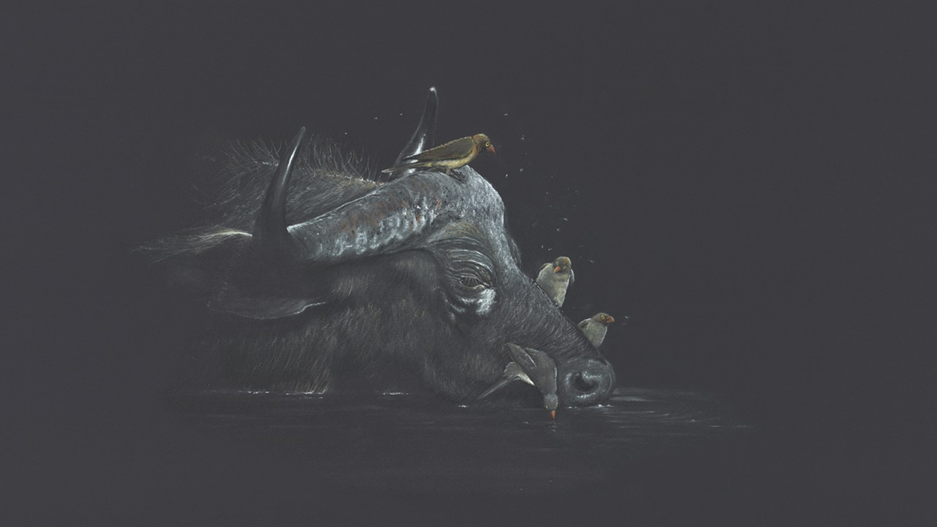 A buffalo with ox peckers drinking at a rivers edge