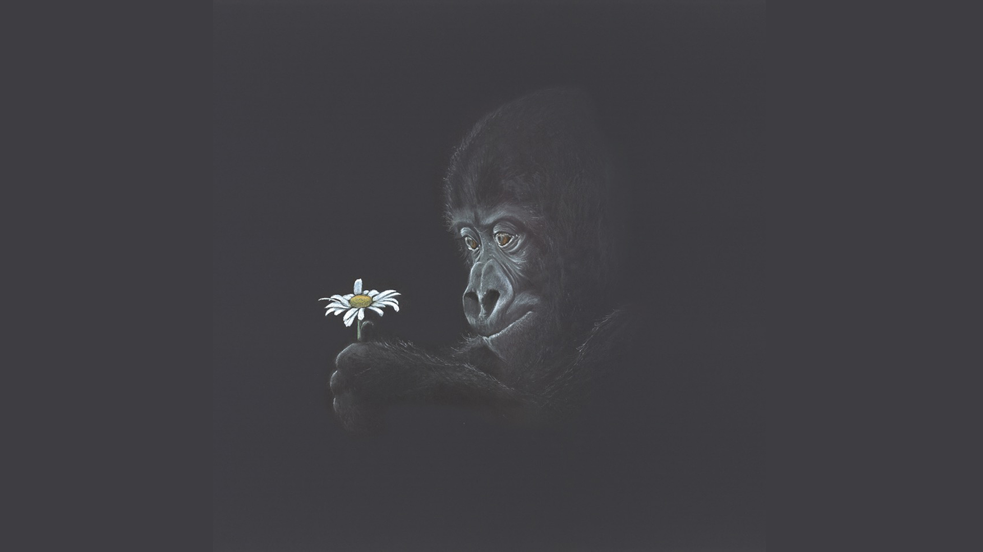 A young gorilla studies a daisy.
